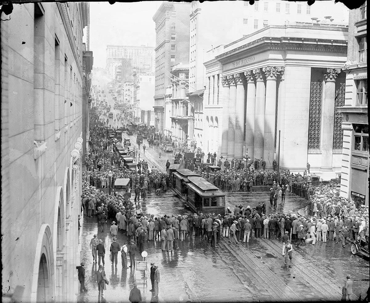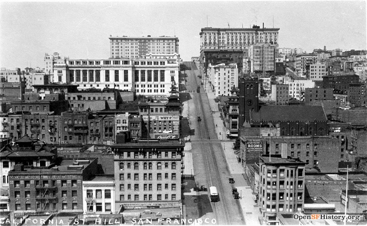 It was a little before 9:00 a.m., the start of the workday. The streets were buzzing with people who were hustling up and down and across California Street on their way to the offices of shipping lines, banks, and insurance companies in the Financial District.
