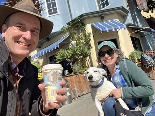Thanks to Woody Beverage Fund contributors like Mike P. (F.O.W.), I had a nice sit outside Java Beach on Judah Street with Denise S. (F.O.W.) and Barnaby the dog (F.O.D.). Denise had a cappuccino, Barnaby abstained, and I got all wild and crazy and tried a butterscotch latte. Not bad, but I wonder if I have crossed some terrible, terrible line...