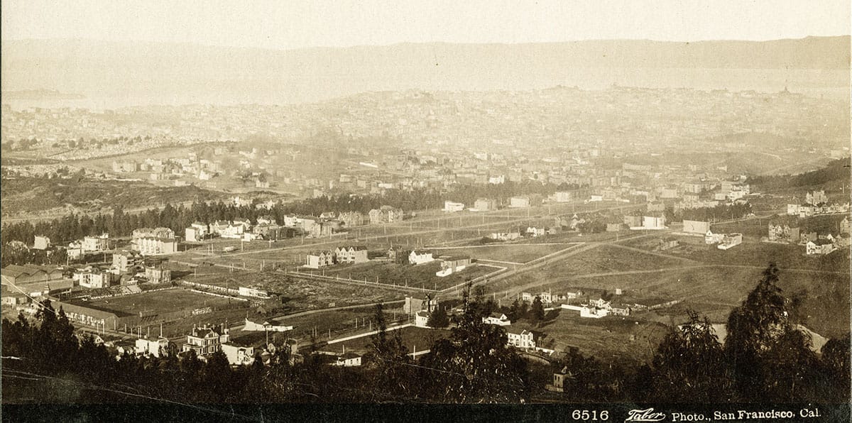 We are looking northeast over the Haight-Ashbury, which still has most of its old dairy grazing land open. That strip of trees running from left to right represents the Golden Gate Park panhandle and... Hark! What is that in the lower left corner?