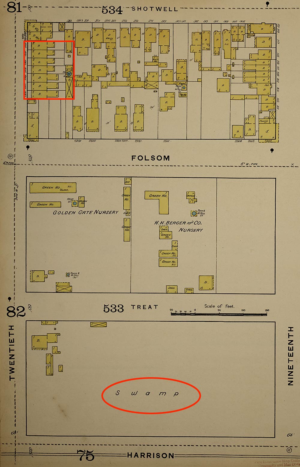 Both photographs document the northern block face of 20th Street between Shotwell and Folsom Streets. The notations make special mention of the residential flats— “Maguire’s houses”—contained in the long mid-block building with the undulating roof line.