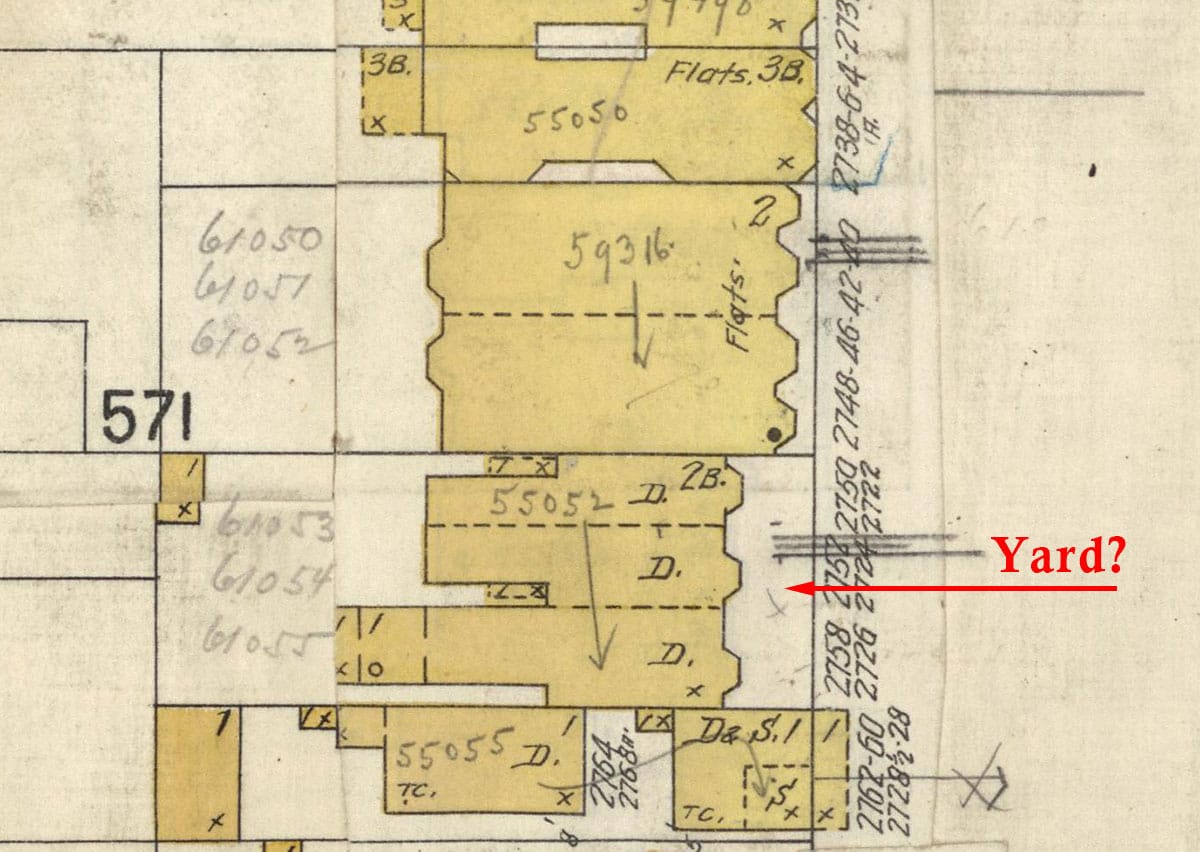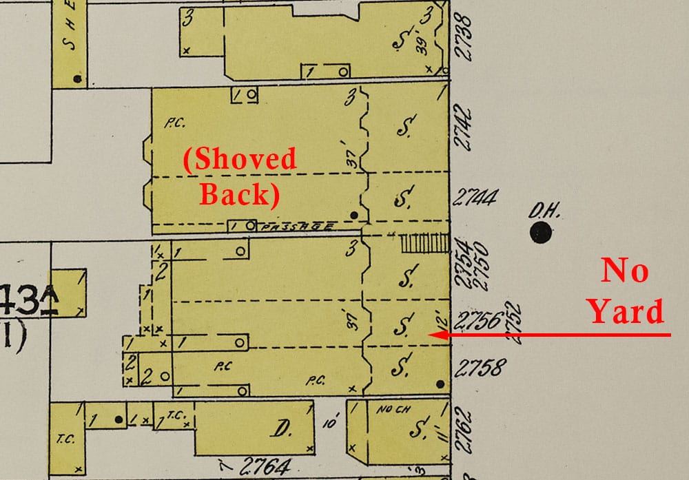 When the Italianate flats at 2750-2758 Mission Street were built in the 19th century, they had a set-back from the street. I like to think the residents had cute little front yards. Here they are depicted on the 1905 Sanborn fire insurance map: