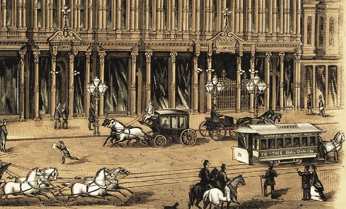 But it wasn’t the city’s first luxury hotel to be constructed from silver-mine wealth. In 1873, Lucky Baldwin was riding perhaps the highest of his highs with a vast fortune made from investments in the Ophir, Crown Point, and other Comstock mines. On the corner of Powell and Market streets—then practically considered the outskirts of town—he began construction on the finest hotel west of the Mississippi River.