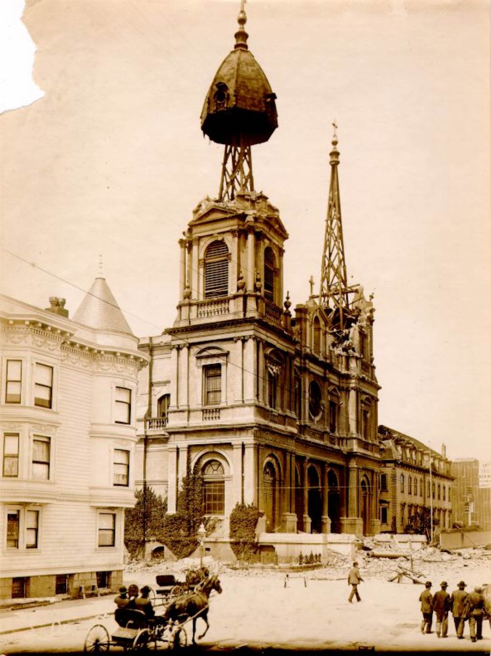 St. Dominic’s Catholic Church at Bush and Steiner Streets, erected in 1887, suffered heavy damage from the earthquake. Its north tower was shaken away to the spire framework and surmounting cross, while the south tower had part of its dome still intact, precariously floating on a point 50 feet above the street.
