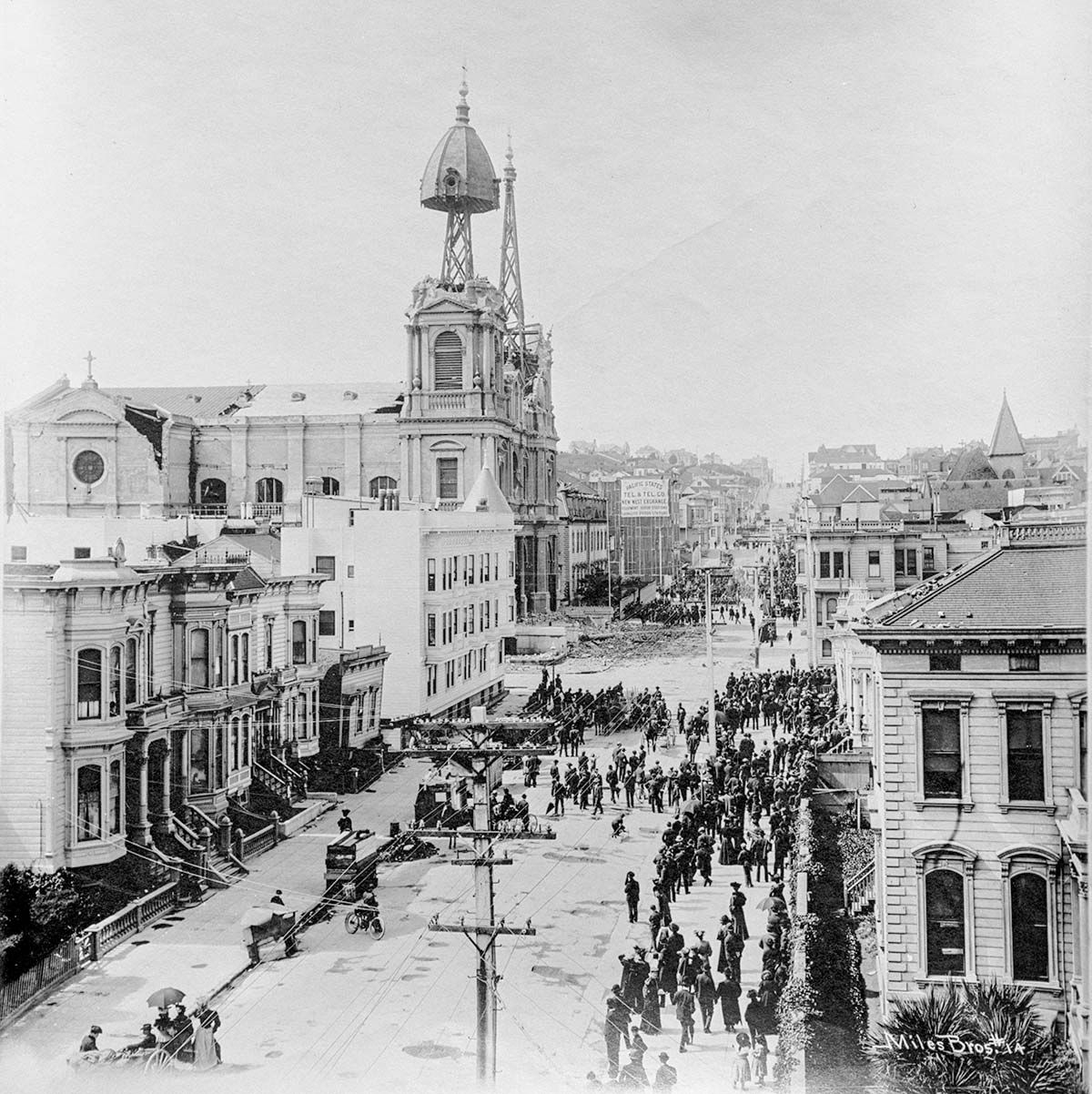 On May 14, 1906, a gang of wreckers was dispatched to pull down the southern tower using a wire cable pulled by a steam engine set up at Pine and Steiner Streets. The cable snapped. The workers tried repeatedly, but each time the cable broke or yanked free of its attachment to the stubborn tower.